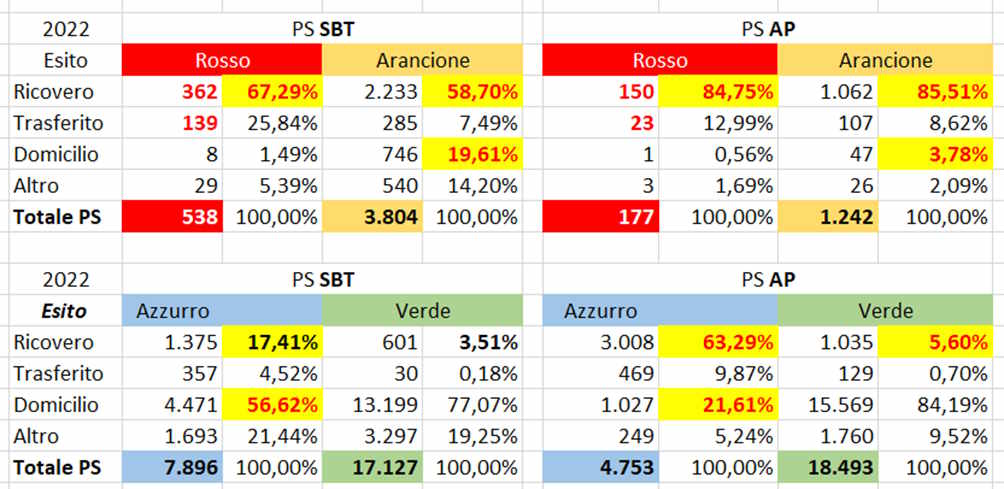 Con il colore Nero ci si riferisce ai pazienti deceduti: 81 per SBT – 50 per AP, con SBT +62% di decessi. Codici Rossi: 538 per SBT – 177 per AP, dunque per SBT +204%. Codici Arancioni: 3.804 per SBT – 1.242 per AP, con SBT +206%. Codici Azzurri: 7.896 per SBT – 4.753 per AP, con SBT +66%. Codici Verdi: 17.127 per ABT – 18.493 per AP, con SBT –7,4%. Codici Bianchi: 404 per SBT – 709 per AP, con SBT –43%.